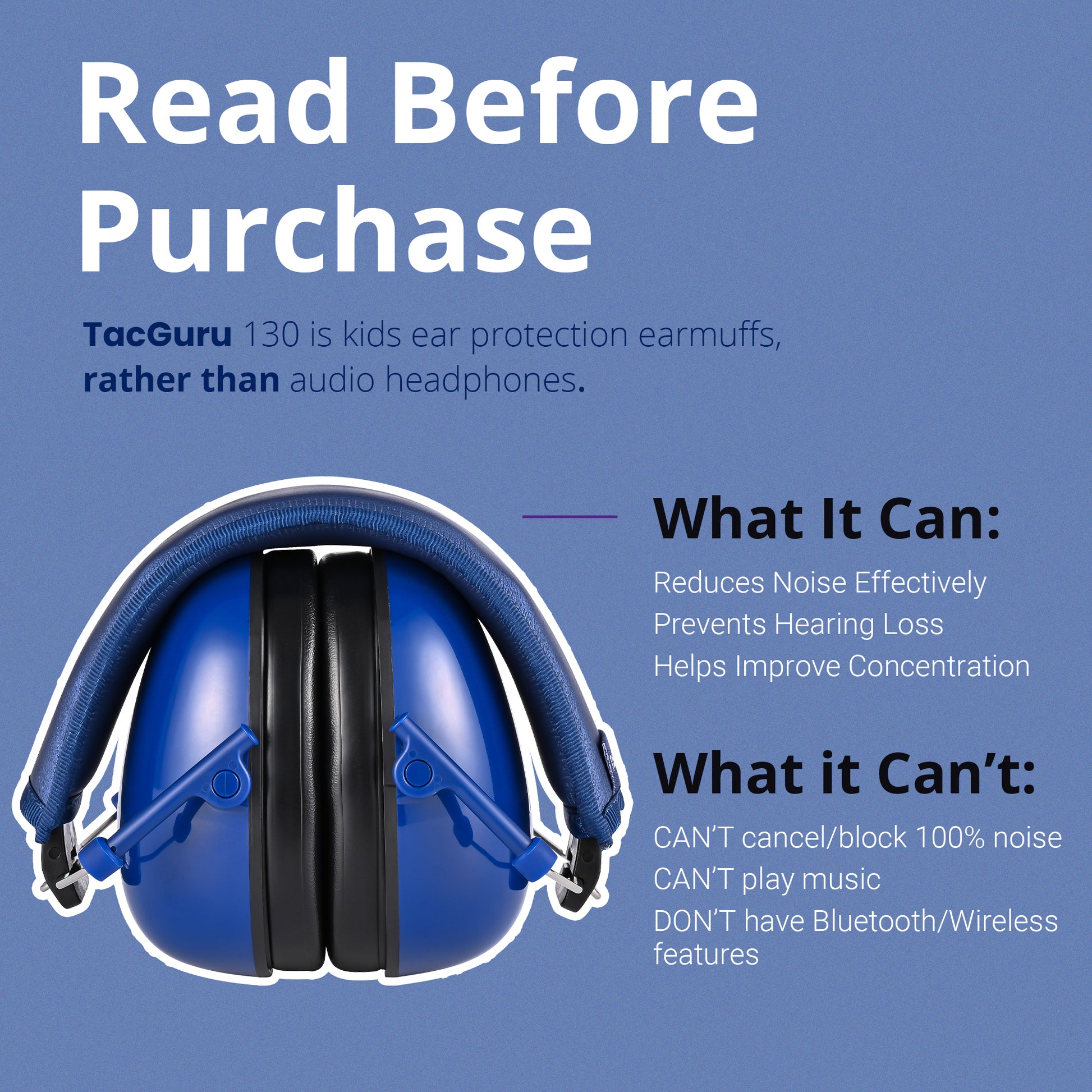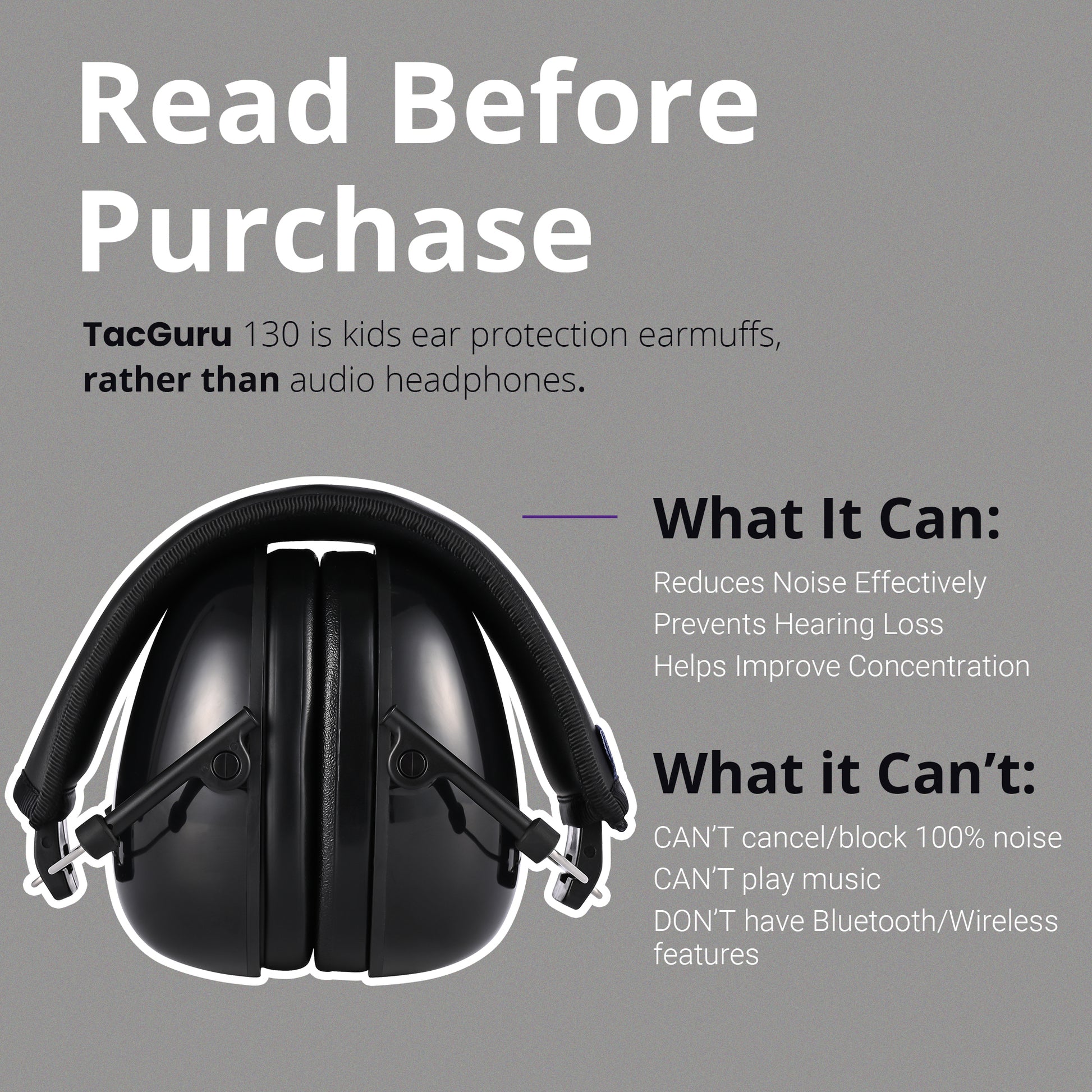 - Adjustable Design: With an adjustable padded headband and soft foam ear cushions, the TacGuru 130 is designed to fit children ages 3 to 16